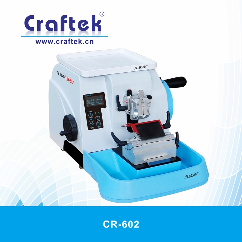 CR-602是本公司在CR-601石蜡切片机研发成功和经历各大医疗单位多年实际应用考验的基础上,采用全新电子控制系统的新一代双控半自动石蜡切片机,该机具有更稳定的机电一体化布局、更精准灵敏的进给驱动、更舒适的触摸操控等优点。改用工业触摸屏幕、优化了最高点锁定机构,拨动更轻松便捷,并增加了机顶储物盘、后部USB插口5V电源输出、预留升级独立控制盒接口等人性化设置。